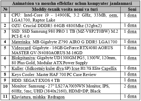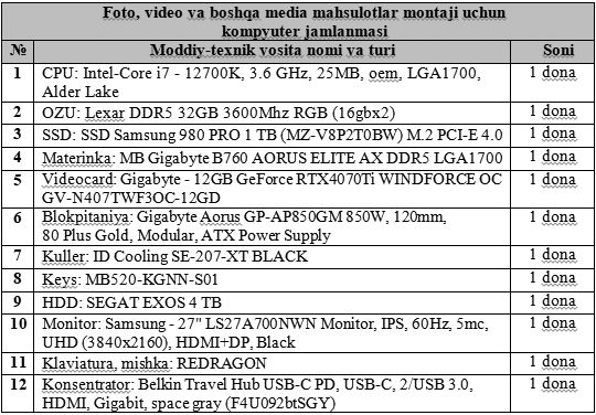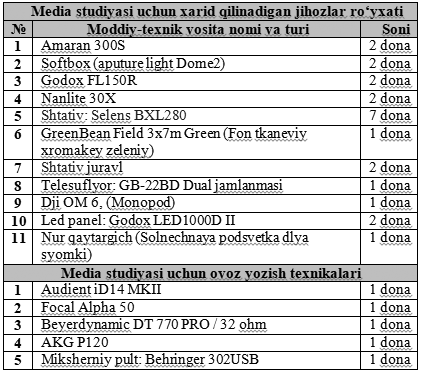 Эслатма! Жадвалда кўрсатилган маҳсулотлар учун танлов жорий йилнинг 16 апрель куни соат 15:00 да партиянинг Марказий аппарати биносида бўлиб ўтади.