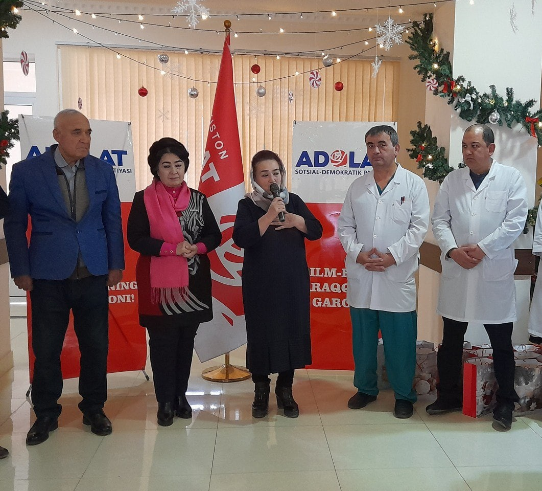 Ана шундай оғир дард билан мардонавор курашаётган жажжи болажонларга озгина бўлсада қувонч улашиш, уларнинг дилларига хушнудлик бахш этиш истагида Ўзбекистон «Адолат» СДП Самарқанд вилоят Кенгаши томонидан Республика ихтисослаштирилган онкология ва радиология илмий - амалий тиббиёт маркази Самарқанд вилоят филиалида даволанаётган бемор болажонлар ҳамда уларнинг ота-оналар ҳолидан хабар олиб байрам тадбири ташкил этилди.