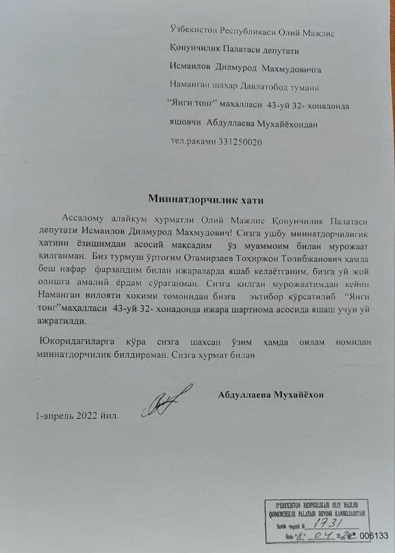 Жумладан депутатимиз сайловчилари билан учрашувларида Наманган шаҳар Давлатобод тумани «Янги тонг» маҳалласида иcтеъқомад қилувчи Абдуллаева Муҳайёхон ва унинг турмуш ўртоғи Тоҳиржон Отамирзаевлар беш нафар фарзандлари билан узоқ йиллардан буён ижарада яшаб келишаётганлигини айтиб, уй-жой олишда амалий ёрдам беришини сўрагандилар. Мурожаат юзасидан олиб борилган ўрганишлар ҳамда бир қатор чора-тадбирлардан сўнг, мазкур масалага Наманган вилояти ҳокимлиги томонидан эътибор қаратилиб, «Янги тонг» маҳалласи 43-уй 32-хонадондан ижара шартномаси асосида яшаш учун уй ажратилди.
