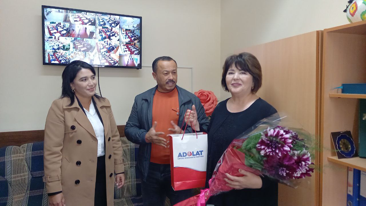 Қувонарлиси, мазкур мактаб-интернати директори Элеонора Дадажанова партия фаоли. Таълим фидойиси Президентимиз Фармони билан Ўқитувчи ва мураббийлар байрами арафасида «Меҳнат шуҳрати» ордени билан тақдирланган. Партия вакиллари Элеонора Дадажановани юксак мукофот билан муборакбод этиб, эсдалик совғаларини топширди.