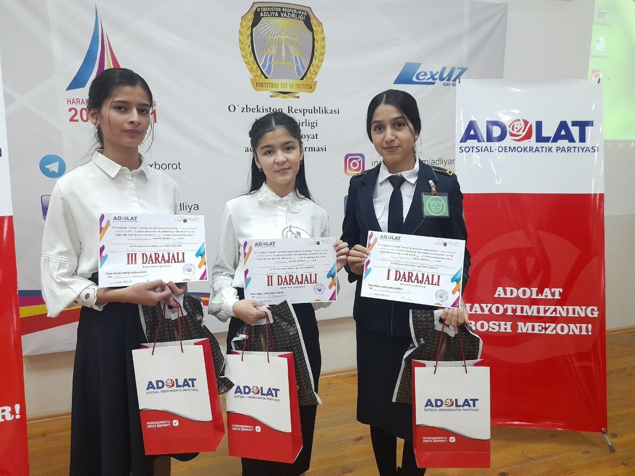 2-ўринни 5-сон умум ўрта таълим мактаби ўқувчиси Зуҳра Рўзимова, 3-ўринни 14-сон умум ўрта таълим мактаби ўқувчиси Мардона Қурбонбоевалар қўлга киритишди. Қолган иштирокчилар фаоллиги учун партиянинг фахрий ёрлиқ билан тақдирландилар.