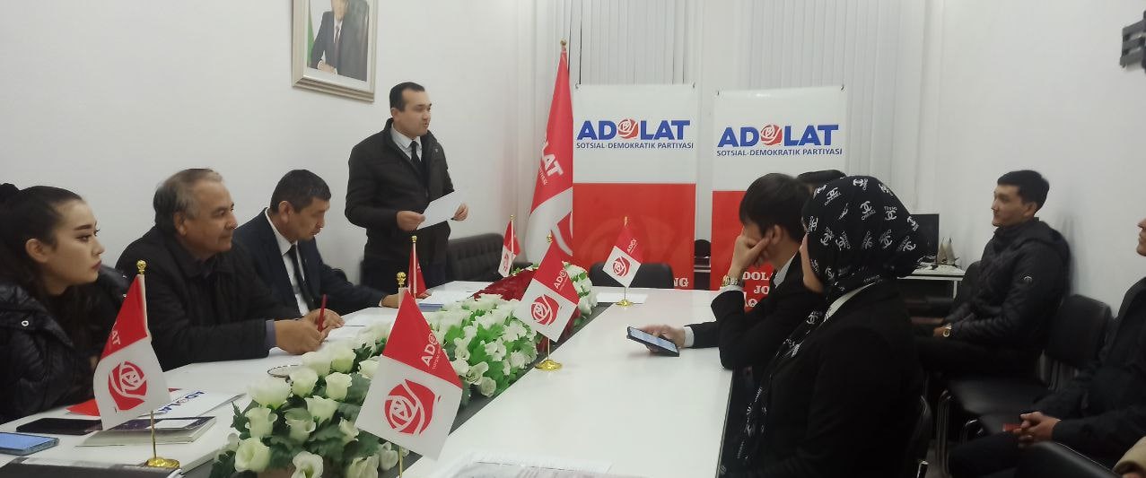 Oʻzbekiston “Adolat” SDP Namangan viloyati Kengashi tomonidan Oʻzbekiston Respublikasi Oliy Majlis Qonunchilik palatasi huzuridagi “Yoshlar parlamenti”ga 43-Doʻstlik va 48-Toʻraqoʻrgʻon saylov okruglaridan nomzodlarini koʻrsatgan yoshlarimiz Nizomda belgilangan tartibda hujjatlarini taqdim etishdi va amaldagi qonunchiligimizga oid savol-javoblar hamda partiya hayotidagi faolligiga qarab baholab borildi.