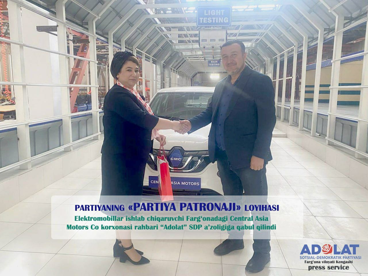 «Аdolat» SDP safiga yangi aʼzolarni qabul qilish, ularga aʼzolik guvohnomalarini oʼz mehnat faoliyatini olib borayotgan joyga borib topshirish ishlari viloyat Kengashi raisi Sh.Gʼaniyeva tomonidan manzilli tashkil etildi. “Partiya patronaji” loyihasi doirasida dastlaab Fargʼonadagi Central Asia Motors Co korxonasi rahbari B.Ahmedov partiya aʼzoligiga qabul qilindi. Korxona yumushlari bilan band boʼlgan yurtdoshimiz bilan partiya loyihalari doirasida tadbirlar tashkil etish, oʼzaro hamkorlikda ishlash yuzasidan kelishib olindi. Keyingi manzil Oʼzbekiston Respublikasi notarial palatasi Fargʼona viloyat hududiy boshqarmasi boʼldi. Loyiha doirasida Sh.Gʼaniyeva tashkilot xodimlariga aʼzolik biletlarini topshirdi. Endi ular biz bilan bir safda. Soʼngi manzil “Moderna ceramic industries Ferghana” MCHJ shaklidagi qoʼshma korxonasi sari yetakladi. Bu yerda partiyaning boshlangʼich partiya tashkiloti tuzildi.