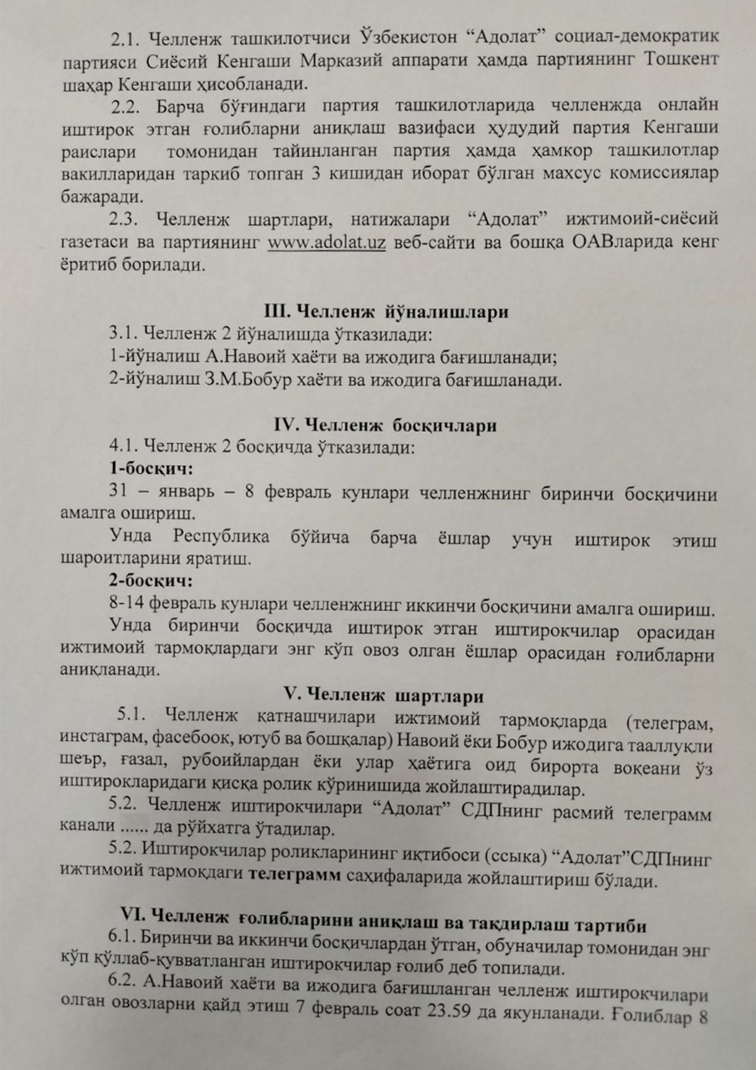 Oʻzbekiston “Adolat” SDP Markaziy apparati hamda Toshkent shahar kengashi tomonidan “Alisher Navoiy va Zahiriddin Muhammad Bobur hayoti va ijodi — bebaho madaniy merosimiz” mavzusida chellenj oʻtkazilishi boʻyicha NIZOM