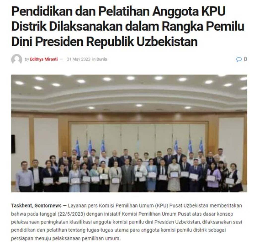 Популярное онлайн-информагентство Индонезии «Gontor News» опубликовало статью под заголовком «Организовано учебно-практическое занятие для членов окружных комиссий по проведению досрочных выборов Президента Республики Узбекистан».