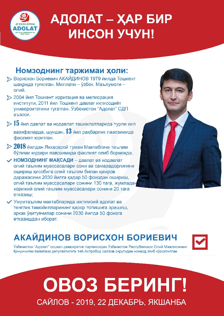 Изоҳ: Тайланд Қироллиги, Индонезия Республикаси, Малайзия, Корея Республикаси, Сингапур Республикаси, Япония ҳамда Хитой Халқ Республикасида бўлиб турган юртдошларимиз ўша давлатларда ташкил этилган сайлов участкаларига бориб 146-Астробод сайлов округидан Ўзбекистон Республикаси Олий Мажлис Қонунчилик палатасига “Адолат” СДПдан кўрсатилган Акайдинов Ворисхон Бориевичга овоз беришлари мумкин.